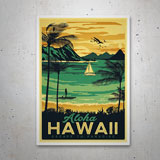 Autocollant Aloha Hawaii. Fantastique illustration du coucher de soleil sur une plage hawaïenne. Le contraste entre les tons jaunes et turquoise donne de la lumière aux silhouettes des palmiers, des montagnes et des hawaino pratiquant le SUP. L'image contient le texte aloha Hawaii escape to paradise. Idéal pour les restaurants de plage.