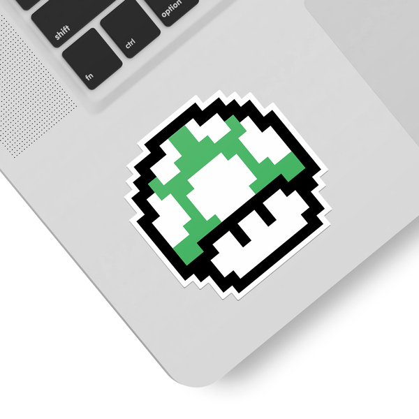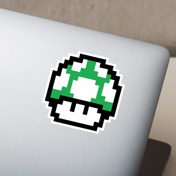 Autocollant Mario Bros Seta Pixel Vert. Design pixélisé de l'un des champignons que vous trouverez tout au long du jeu. C'est vert pour la première fois dans Super Mario Bros. et son action est que lorsqu'il est utilisé, il donne à Mario une nouvelle vie. Ce type de champignon est difficile à trouver.