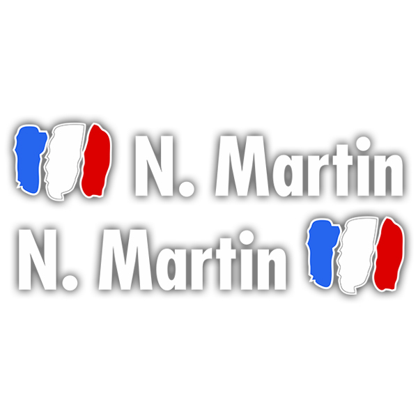 2X Autocollant Drapeaux France + Nom en blanc. Personnalisez l'autocollant avec votre nom et le drapeau français. Set avec un autocollant de chaque côté de votre voiture, casque ou moto. Ces adhésifs n'ont pas de fond. La longueur du autocollant dépend de la longueur de son nom. La hauteur est celle du drapeau