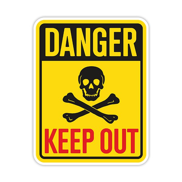 Autocollant Danger Keep Out II. Signe visuel d'interdiction d'accès. Le fond jaune fait que le panneau attire notre attention avec cette couleur frappante ainsi que les lettres rouges et si vous ajoutez une tête de mort au centre, vous pouvez comprendre que peut-être entrer n'est pas une bonne option.
