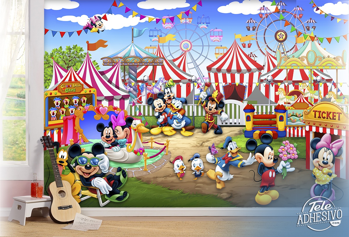 Poster XXL Parc d'attractions Disney. Amusante murale d'un parc d'attractions avec Mickey Mouse et ses amis. Minnie, Donald Duck, Goofy et Pluto ne peuvent pas manquer cette fête. Idéal pour la chambre du plus petit de la maison, qui profitera de tous ces personnages Disney.
