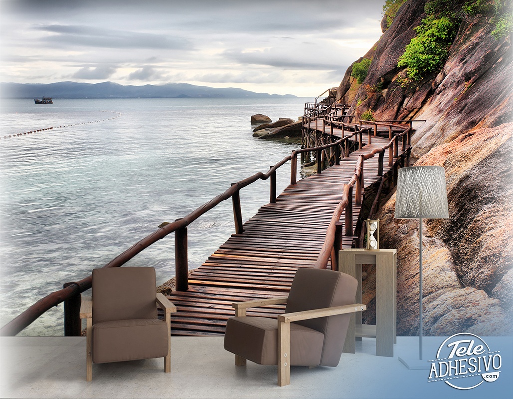 Poster XXL Passerelle au bord de la mer. Image d'une passerelle serpentine attachée au mur qui borde une partie d'une roche collée à la mer. Le jour est nuageux mais la mer semble calme. Au loin, vous pouvez également voir un petit bateau peut-être d'un pêcheur de la région.
