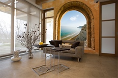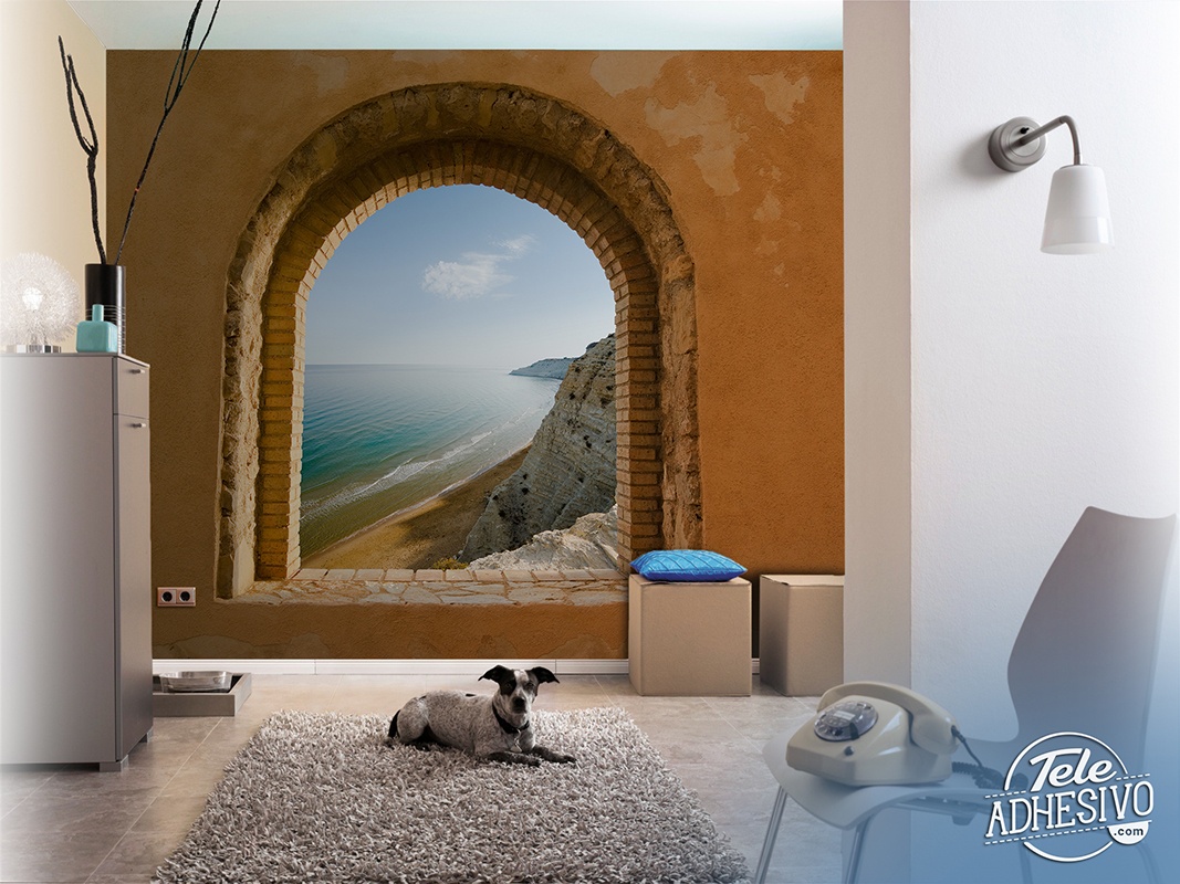 Poster XXL Fenêtre sur la mer. Un paysage d'une belle plage. Les vagues d'une mer calme atteignent le sable et le bleu de la mer se mêle à celui du ciel créant une composition belle et relaxante. Tout cela vu depuis une fenêtre. La nature ne cesse de nous étonner avec des images comme celle-ci.
