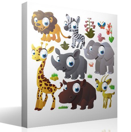 Sticker mural enfant Kit Animaux de la jungle. Il se compose de plusieurs animaux emblématiques de la savane africaine. Le lion, la girafe, le zèbre, l'éléphant, le rhinocéros, l'hippopotame et la gazelle, accompagnés de deux papillons, caricaturés dans un style naïf et réunis en un seul kit.