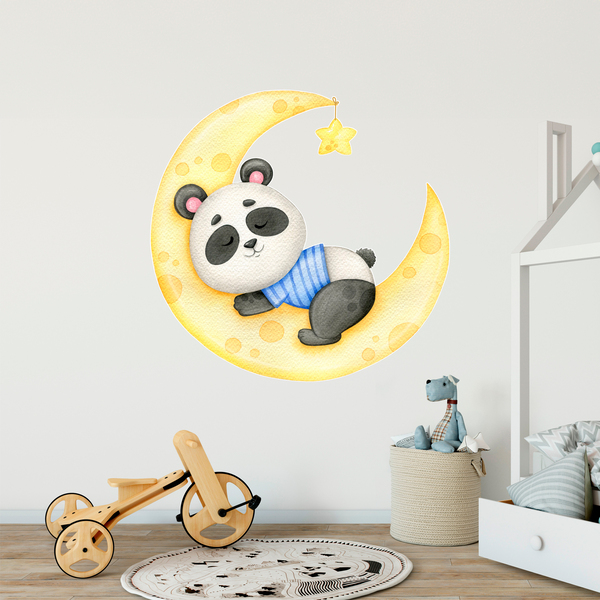 Sticker Mural Enfant Le anda dort sur la lune. Un adorable panda d'enfant dort confortablement en serrant la lune dans ses bras. Il porte un pyjama bleu et, d'après son visage, on dirait qu'il dort très confortablement. Décorez une chambre d'enfant avec ce joli design.