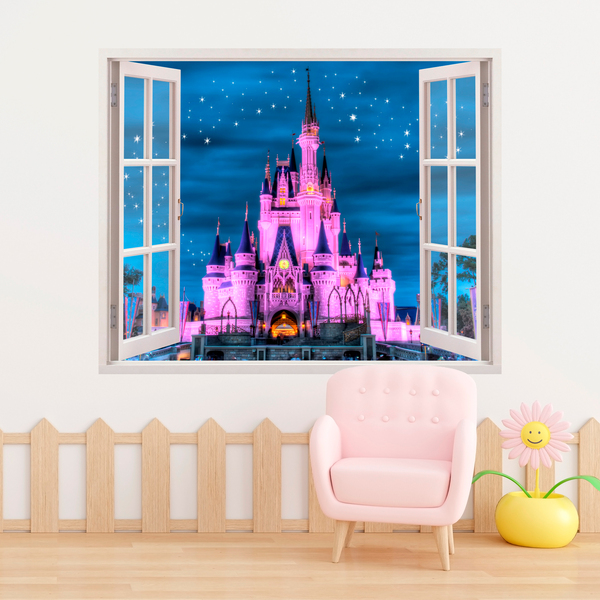 Sticker mural enfant Fenêtre Château de Disney. Ouvrez une fenêtre élégante sur vos murs avec cette fenêtre ouverte sur le château de Diseyland. C'est une scène de nuit avec un beau ciel étoilé où le château est illuminé de tons roses. Idéal pour la chambre des enfants.