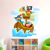 Sticker mural enfant Pirates naviguant sur un bateau. Il y a 3 enfants pirates et leur petit singe, à bord de leur bateau pirate. Ils sont très heureux car ils ont la carte au trésor. Des boucaniers, des navires et des drapeaux de pirates, des garçons de cabine, des pansements oculaires, des trésors, des canons, des barils et des épées.