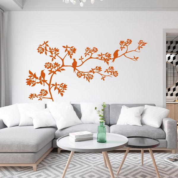 Sticker mural Branche d'un arbre au printemps. Arbre au printemps avec ses fleurs et ses feuilles, 3 beaux oiseaux s'y perchent. La distribution horizontale, ce vinyle est idéal pour l'installation dans les coins. Cela donnera une touche naturelle à notre mur.