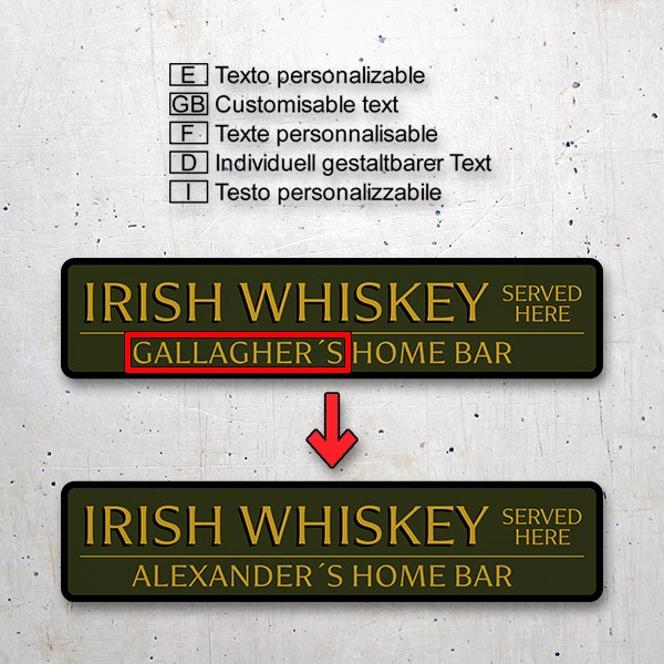 Sticker Mural Irish Whiskey. Un design original que vous ne pouvez pas manquer si vous êtes un amateur de whisky ou si vous avez un pub irlandais. Sur le panneau, vous pouvez lire en anglais "On y sert du whisky irlandais" et en dessous, vous pouvez mettre votre nom ou le nom de votre bar ou de votre entreprise suivi de la phrase "Le bar fait maison".