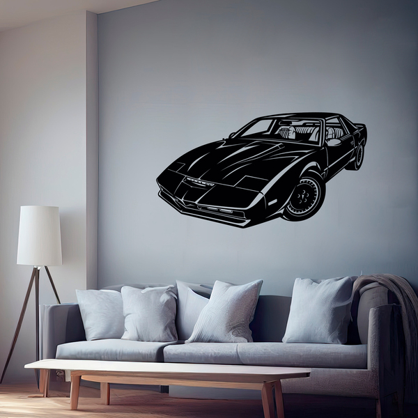 Stickers deco cinema Knight Rider Kitt. Image de la célèbre série des années 80, Knight Rider, mettant en vedette David Hasselhoff dans le rôle de Michael Long. Ensemble avec sa voiture Kitt ils ont combattu le crime, en défendant les sans défense. Il a été caractérisé comme une voiture parlante.