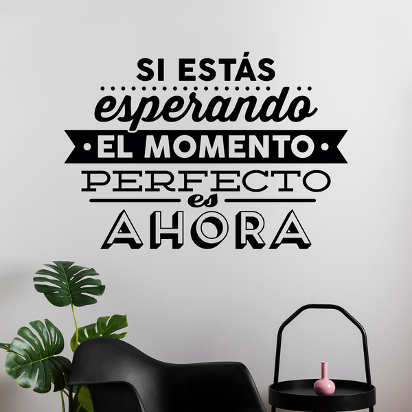 Sticker mural El momento perfecto. Conception typographique de la phrase de motivation en espagnol: Si vous attendez le moment idéal, c'est maintenant. Des phrases ou des citations célèbres transforment les murs en une toile dans laquelle les émotions sont exposées et nous aident à voir la vie de manière plus positive.