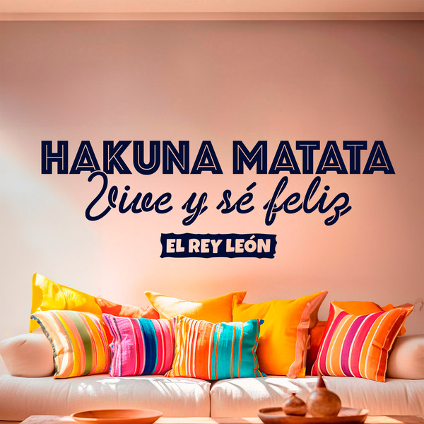 Sticker mural enfant Hakuna Matata, en espagnol. Dessin typographique du célèbre refrain de la chanson principale du film de Disney "Le Roi Lion", chanté par Timón et Pumba. Les textes sont en espagnol. C'est une expression de la langue swahili qui se traduit par "ne vous inquiétez pas".