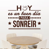 Sticker de cuisine aujourd'hui est un bon jour pour sourire. Design amusant et motivant avec la phrase en espagnol, Aujourd'hui est un bon jour pour sourire. Plusieurs typographies sont combinées avec des fleurs et le célèbre smiley remplace le "o" de manière originale. Décorez votre maison avec cet autocollant.