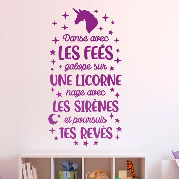 Sticker Mural Enfant Danse Avec les Feés. Modèle à placer verticalement avec le texte en français. Une phrase à placer dans une chambre d'enfant qui parle de fées, de licornes et de sirènes et vous encourage à réaliser vos rêves, décorez d'une manière différente avec ce motif.