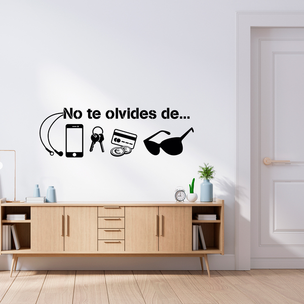 Sticker mural No te olvides de... Ce vinyle décoratif utile vous aidera à ne pas oublier votre iPod, votre smartphone, vos clés, votre argent ou vos lunettes de soleil. Ce sont des compléments presque essentiels dans notre quotidien. Idéal pour installer dans notre hall ou l'entrée de la maison.