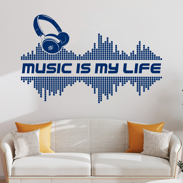 Sticker mural Music is my life. Conception de casques de musique au-dessus d'un égaliseur, qui est divisé par la phrase : La musique est ma vie. Cette phrase en anglais signifie : La musique, c'est ma vie. Idéal pour les amateurs de musique électronique et de musique en général.