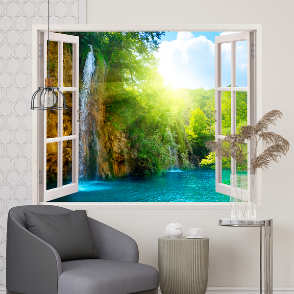 Poster XXL Paradis. Ce trompe l'oeil simulera une fenêtre ouverte sur votre mur, c'est un paysage magnifique, composé d'une belle cascade qui tombe sur un lac calme flanqué d'une végétation exubérante. Un trompe l'oeil de rêve. Une image pour n'importe quelle pièce de votre maison.