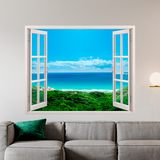 Poster XXL Vues à la mer. Ce trompe l'oeil simule une fenêtre ouverte sur votre mur avec de belles vues sur la mer. Image sereine et calme de l'eau à côté de la plage dans un endroit paradisiaque, les eaux sont tellement cristallines que le fond se voit parfaitement. Pour n'importe quelle pièce de votre maison.