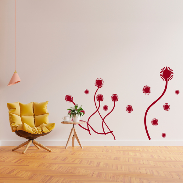 Sticker mural Floral Pirux. Un dessin dont les formes géométriques curvilignes rappellent la plante des tiges de «pissenlit» sans feuilles tient la fleur vivace qui sèche quand le vent souffle. On le trouve facilement sur les routes, les pâturages et les prairies. Design original et amusant.