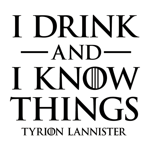 Sticker mural Jeu des Trônes I drink and I Know things. Je bois et je sais des choses, une des phrases de la série prononcée Tyrion Lannister dans Jeu des Trônes. Le texte est en anglais avec la typographie de la série, un vinyle que de nombreux fans de la série vont adorer et pourront en décorer leur maison.