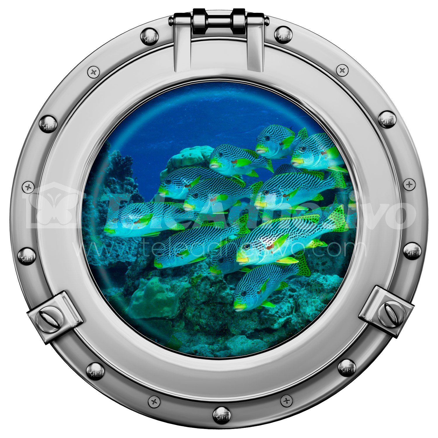 Sticker mural hublot (fenêtre circulaire) à travers lequel vous pouvez voir un banc de poisson