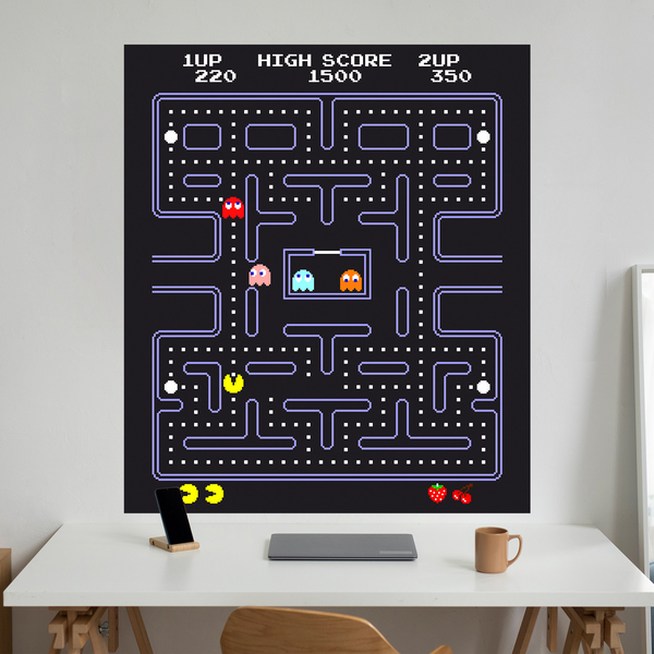 Sticker mural enfant Pac-Man Arcade Game Couleur. Appelé Comecocos en Espagne. Il a été créé par Toru Iwatani de Namco au début des années 1980. Depuis le lancement de Pac-Man, c'est un succès. C'est devenu un phénomène mondial dans l'industrie du jeu vidéo.