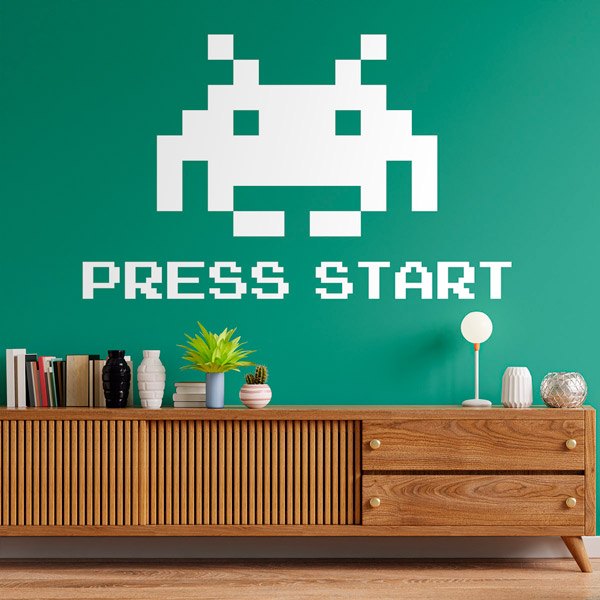 Sticker Mural Space Invaders Press Start. Design original de l'un des envahisseurs de l'espace qui apparaissent dans le jeu vidéo Martian killer de Taito en 1978. En dessous, vous pouvez lire "PRESS START", une fois que vous aurez appuyé dessus, le jeu commencera. C'est très facile à placer, commandez maintenant. Vous avez le choix entre plusieurs tailles et un large éventail de couleurs. Idéal pour décorer facilement les véhicules, les murs, les portes et la plupart des surfaces.