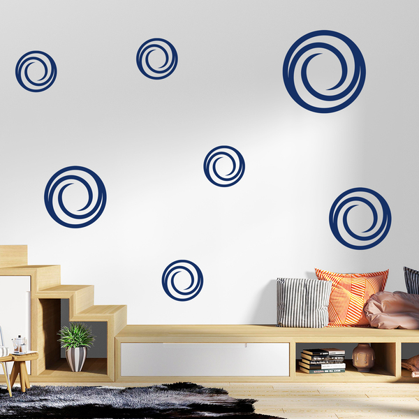 Sticker mural Kit 7 cercles G. Kit composé de 7 cercles avec une spirale à l'intérieur. L'un est légèrement plus grand, deux sont identiques et les quatre autres sont identiques. Chacune des mesures admissibles est tirée de la feuille qui contient toutes les unités et non de chaque figure distincte.