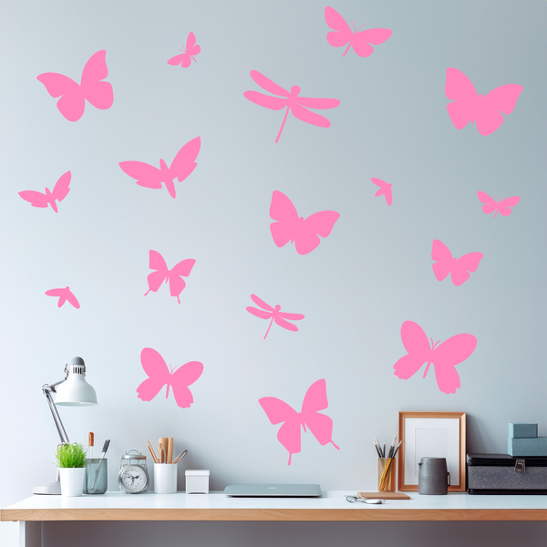 Sticker mural Kit 17 Insectes. Ce kit est composé de différents types d'insectes, tels que des papillons ou des libellules. Les insectes ont une grande signification spirituelle et sont considérés comme des nettoyeurs de nos mondes. En utilisant des ciseaux, nous pouvons les séparer et faire notre propre composition.