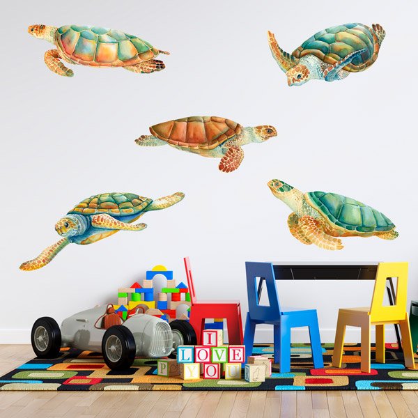 Sticker Mural Famille de la Tortue. Merveilleux ensemble décoratif d'autocollants avec des animaux marins dans lequel vous pouvez trouver différentes variétés de tortues qui peuvent être installées séparément. Décorez les chambres, salons et pièces de votre maison avec ce kit saisissant et donnez un air frais et chaleureux à vos espaces de manière très simple.