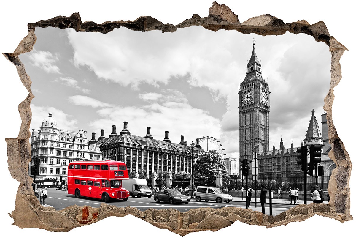 Sticker mural Trou Big Ben à Londres. Ce trompe-l'œil simule un trou dans votre mur. Grâce à lui, nous pouvons visiter Londres. Nous voyons le Westminster Palace et le London Eye à l'arrière-plan, entre autres. Il s'agit d'une image en niveaux de gris contrastés par un bus rouge mythique.
