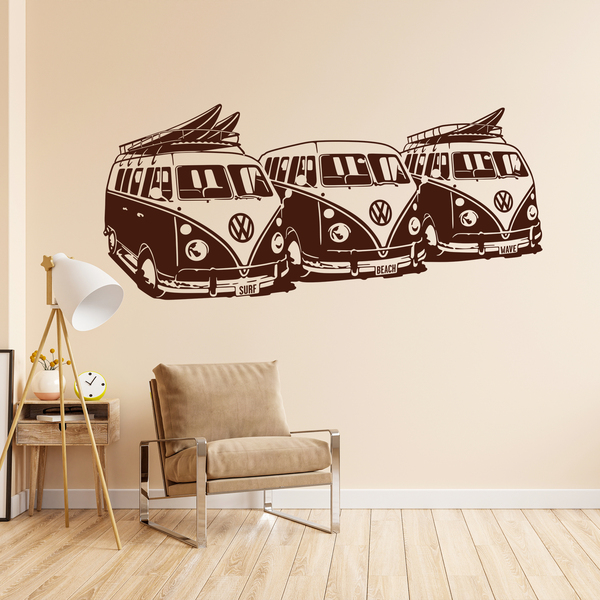 Sticker mural 3 Volkswagen Surf Vans. Le légendaire modèle Volkswagen California a été fabriqué par Westphalie, jusqu’à ce que Chrysler achète la société et que Volkswagen commence à construire sa propre gamme de camping-cars. Ce vinyle décoratif porte l’esprit de plage authentique du surf.