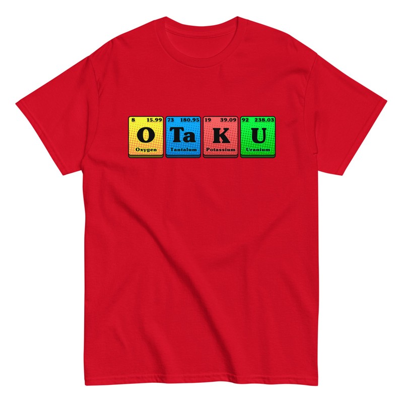 T-shirt amusante pour les fans d'anime, représentant le mot Otaku avec des symboles du tableau périodique des éléments chimiques.