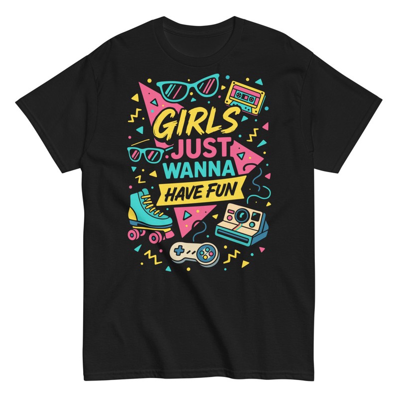 Célébrez l'hymne d'une génération avec ce t-shirt des années 80 coloré et plein d'énergie. Le design, inspiré de la phrase iconique "Girls Just Wanna Have Fun", combine des éléments rétro comme des patins à roulettes, une manette de jeu vidéo et une cassette. C'est le vêtement parfait pour les filles à l'esprit libre qui aiment la culture pop des années 80 et la musique qui a marqué une époque. Idéal pour une soirée à thème, un concert ou pour ajouter une touche de fun.